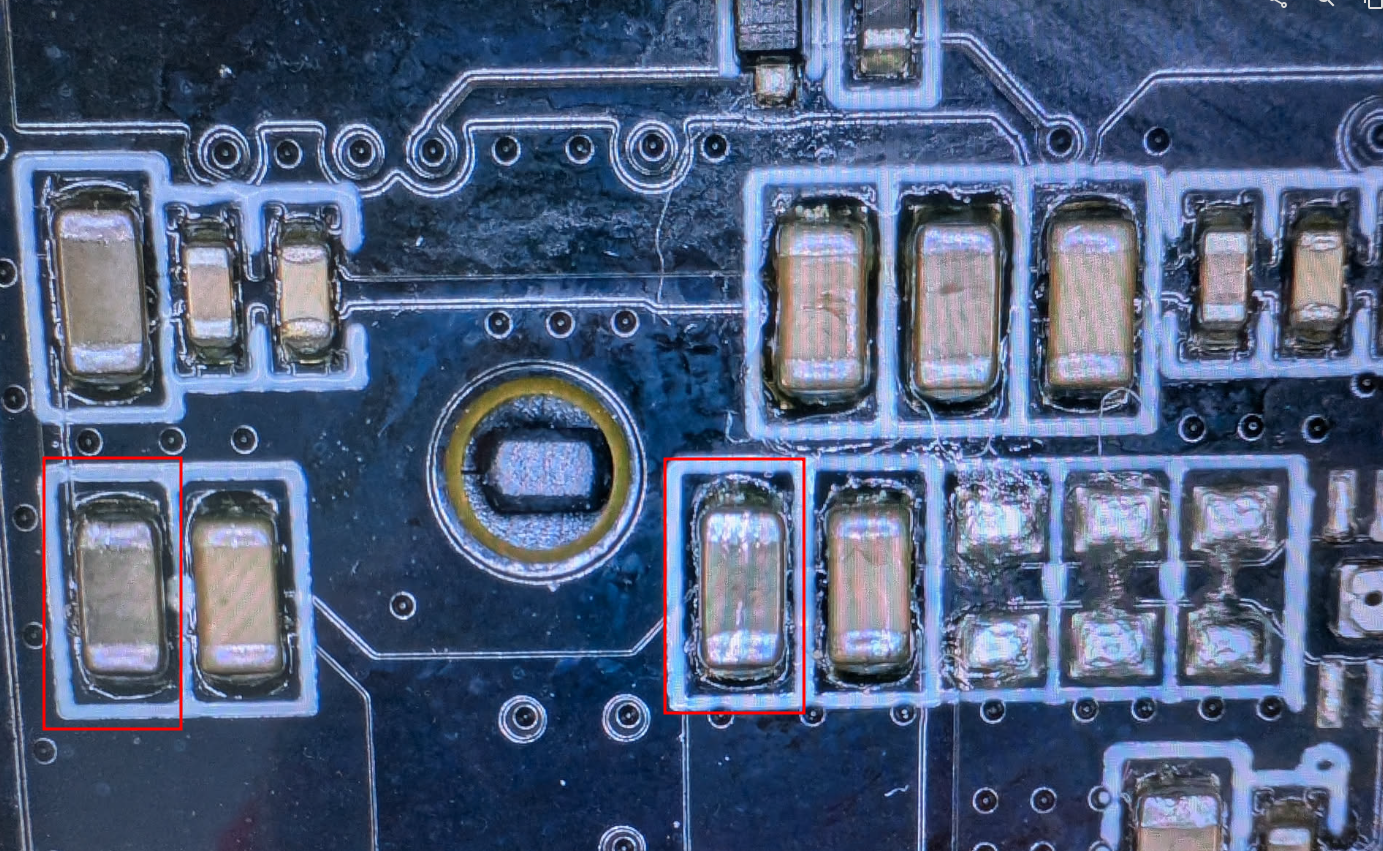 I desoldered the regulator, but we still had a short to ground. I upped the current a bit more, and lo’ and behold, there were 2 capacitors exposing themselves… :-)